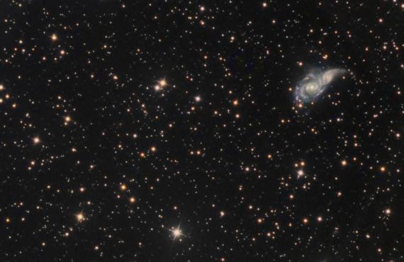 NGC2207 and IC2163 are a pair of interacting galaxies in the constellation Canis Major. These galaxies are located around 82 million light years away. NGC2207 is in the process of "tidal stripping" IC2163. This galaxy interaction is also likely fairly young. There are not too many amateur images of this galaxy pair. They tend to be pretty small and it is a bit difficult to get the detail on these. This pair has, however, been imaged by both Hubble and Spitzer. Rob Gendler has processed the Hubble data and his result is here. I really need better resolution to pick up much more detail. Note, this also has a limited amount of both color and luminosity data included. |